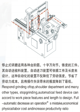 5、修整裝置:采用鑄鐵FC-30 ,經(jīng)熱處理,精密研磨及鏟花加工而成;特殊設(shè)計的油壓修整系統(tǒng),配合無段變速,確保修整平穩(wěn),真直;通過研磨時,可按工件及需要,導(dǎo)輪修整座可做±5°旋轉(zhuǎn),使工件與導(dǎo)輪接觸之更好,研磨工件之真直度及表面粗糙度相對提高,且效率之更高。